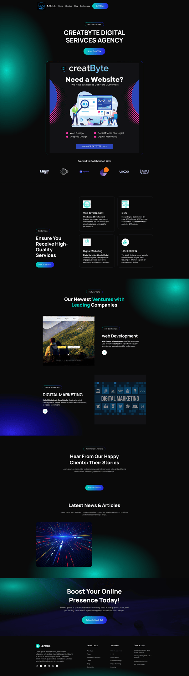 This demo project simulates the creation of a comprehensive website for a digital agency. The goal was to design a site that highlights the agency’s services, expertise, and portfolio, with an emphasis on providing a seamless user experience, modern design, and lead generation features.